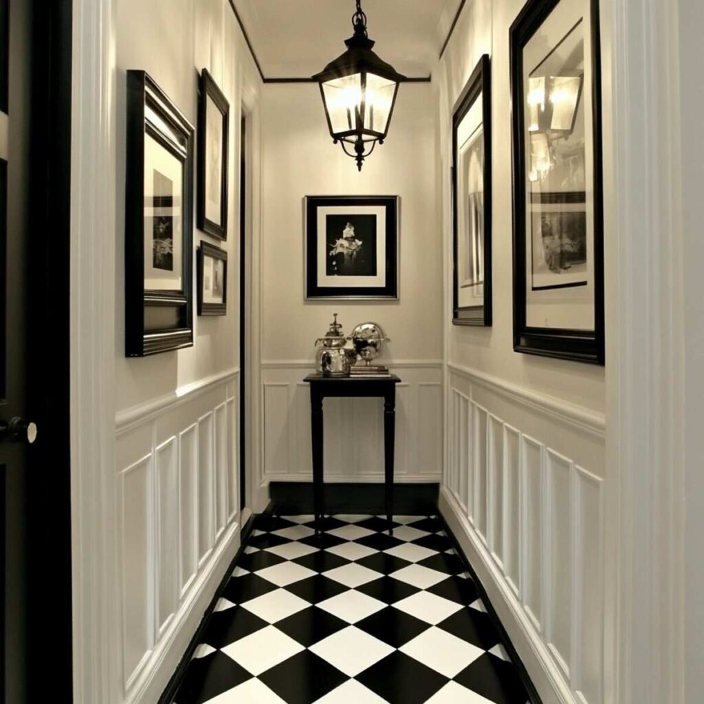 Hallways and entryways benefit from the instant impact of monochrome tiles. These are the spaces that set the tone for the entire home, and a checkerboard or bordered pattern can make a lasting impression. Diagonal layouts visually widen narrow corridors, while decorative borders add texture and charm. For homeowners who love period-style interiors, patterned encaustic tiles in black and white also make a strong comeback in 2025.