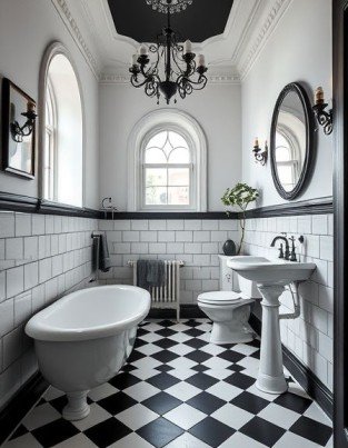 Framed mirrors, wall sconces, and decorative moldings add sophistication. Stick to muted tones—off-white tiles and soft black accents evoke a polished, heritage-inspired look that never fades out of fashion.